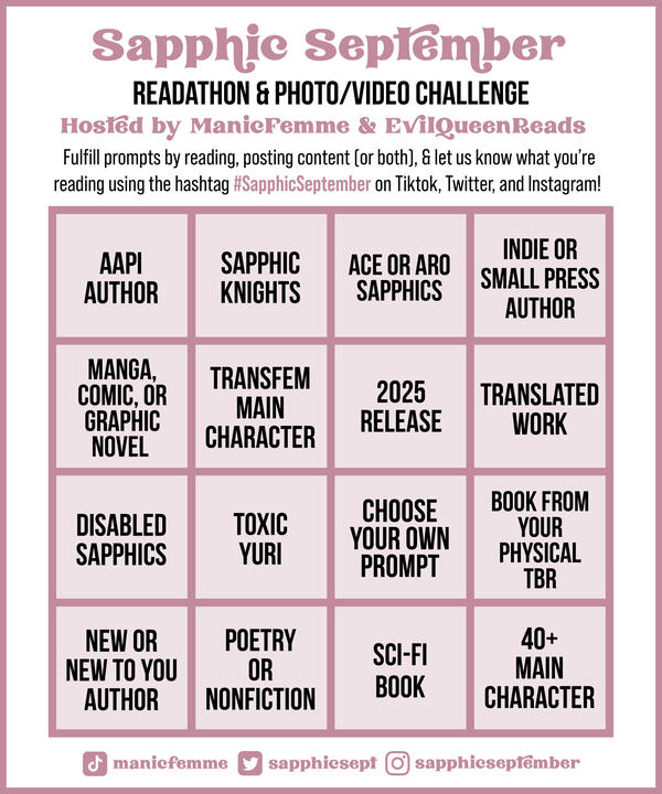 Sapphic September is an annual, month long readathon hosted by Landice (aka ManicFemme) and their best friend Lexi (aka EvilQueenReads) every September! This year will be our sixth Sapphic September in a row.The Sapphic September bingo card includes 16 reading prompts, but to keep things as fun and stress free as possible, we've added a bit of a twist - in addition to reading, you can also fulfill a bingo prompt by posting a photo/video of a sapphic book that fits it! You may also use one book to fulfill multiple prompts.Obviously, the aim of any readathon is to encourage participants to read more books, but we allowed this method of prompt fulfillment in both 2020 & 2021 and then decided to implement it permanently in hopes it will allow more people to participate however much they want or are able to.That being said, we're hosting a giveaway to reward those who do take this opportunity to read more sapphic books. Check the giveaway tab in the menu for more information!